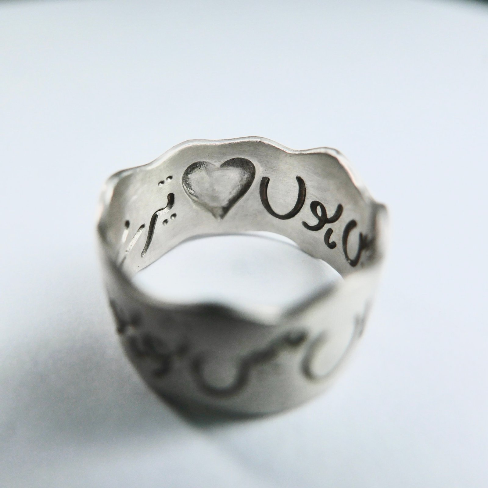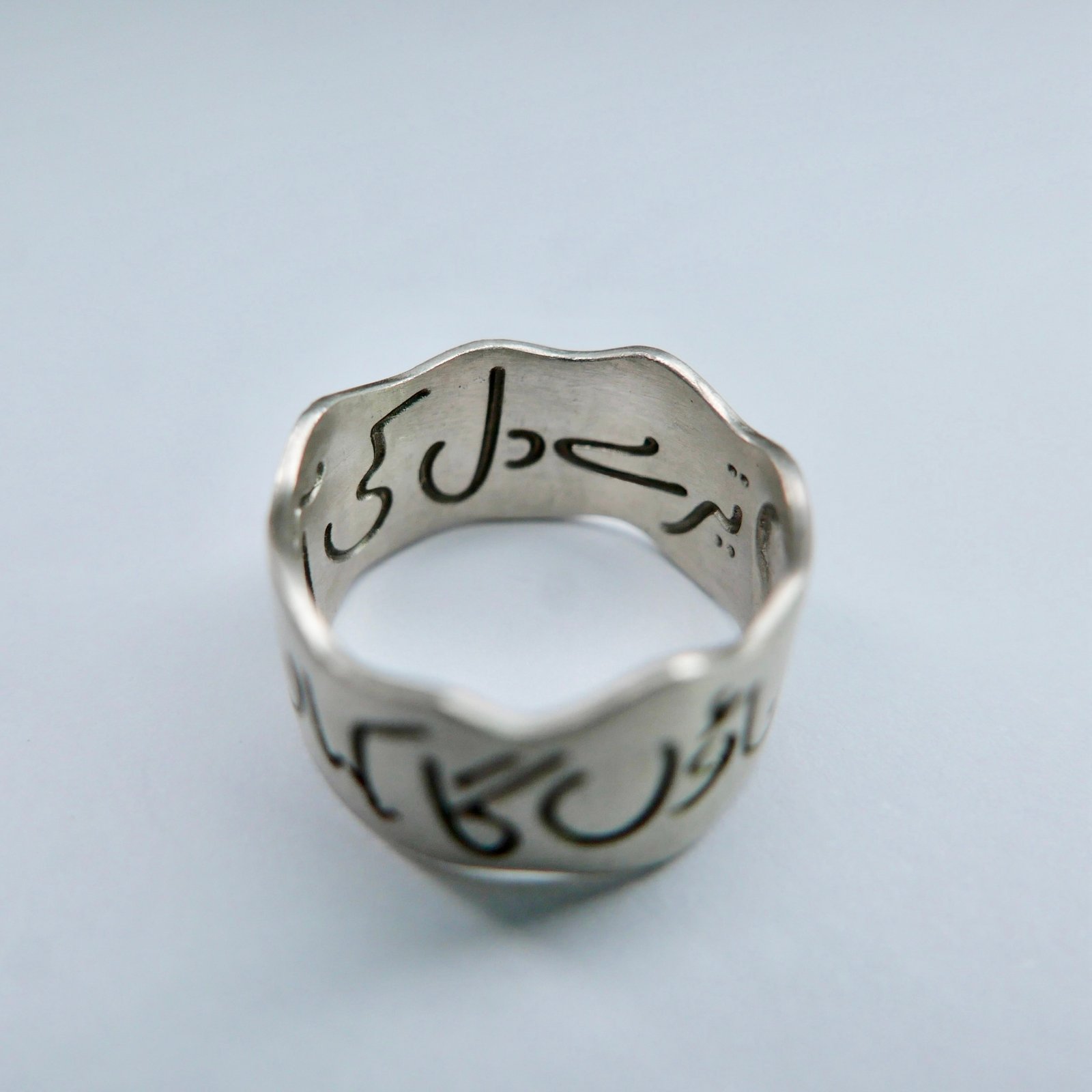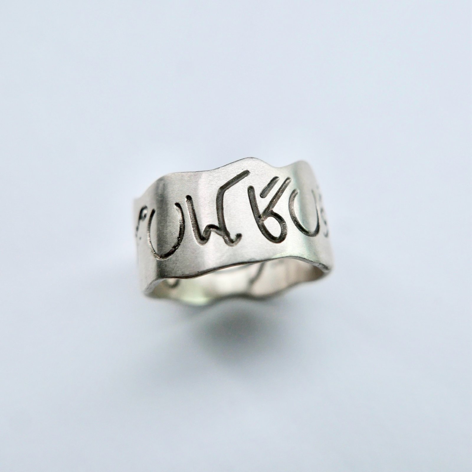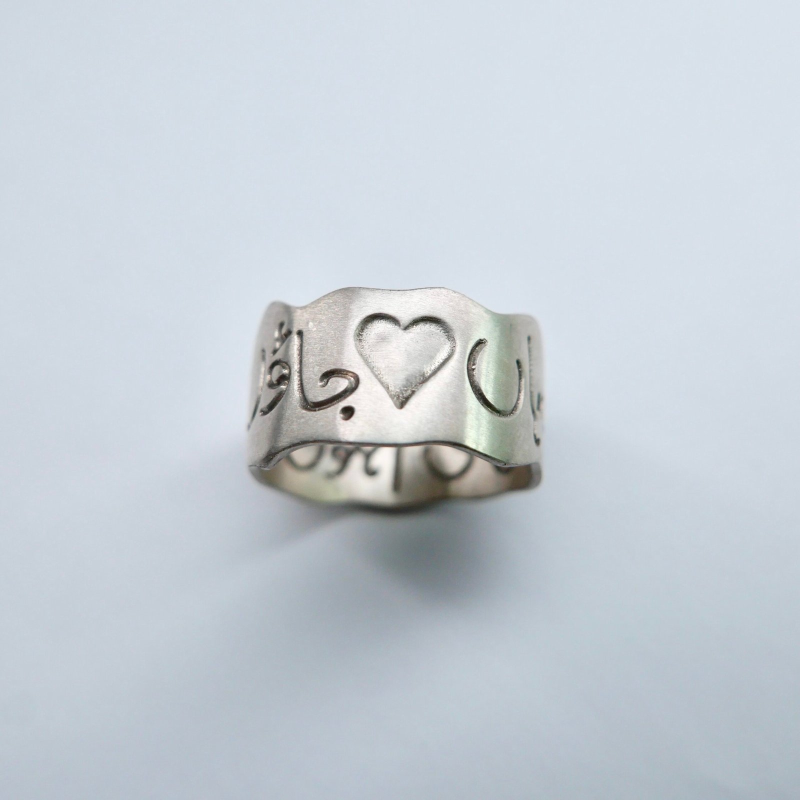 This ring is 3d modelled and casted in sterling silver. It is then hand finished in brushed texture so that the text is easily legible. Made to order to your requested ring size.